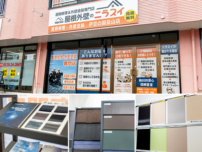 屋根外壁のニラスイ 伊豆の国韮山店では、実際に“見て・触れて”ご確認いただける外壁・屋根のサンプルや、塗装をご検討の際に役立つカタログをご用意しております。