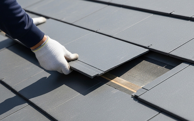 ヒビ割れや小さな欠けにはコーキングや補修材を充填して防水性を高め、剥がれがある場合は傷んだ部分だけを交換して補修します。広範囲に傷みが進んでいる場合は、部分補修だけでなく葺き替えや屋根カバー工法による対応が必要になることもあります。