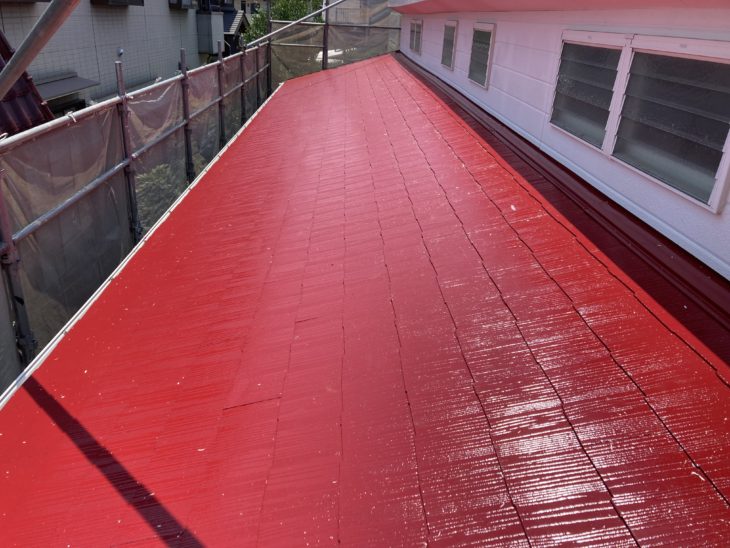 今回の屋根塗料は3回塗りで仕上げていくタイプで、艶のある塗料なので特に塗りたてはツヤツヤが目立ちとてもきれいな発色になります。